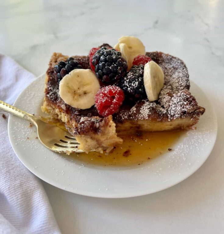 Made with thick slices of Texas toast, it bakes up soft and custardy on the inside with golden brown, lightly crisp edges. It’s everything you love about classic French toast but with a twist.